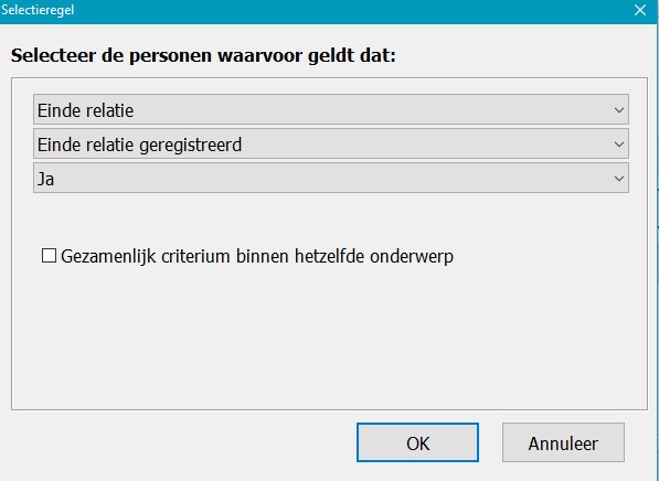 -Lampje- Als u bij Huwelijk op tabblad Beëindiging gekozen hebt voor Uitgesproken of Geregistreerd, dan kunt u deze keuze weer ongedaan maken door in dit tabblad de Shift-toets ingedrukt te houden en nogmaals op Uitgesproken of Geregistreerd te klikken.