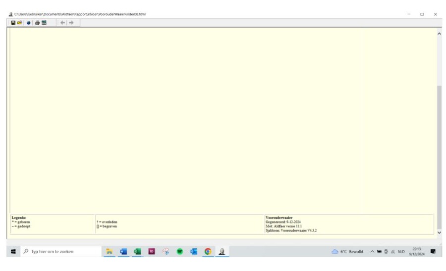 Een tijdje geleden maakte ik enkele voorouderwaaiers aan. Nu lukt me dat niet meer. Het programma maakt blijkbaar wel de waaier aan maar ik krijg enkel een blokje te zien. Mogelijk heb ik iets fout gedaan bij het wijzigen van mijn instellingen. Misschien is het maar een kleinigheid maar ik ben geen expert in Aldfaer. Kan iemand me helpen?