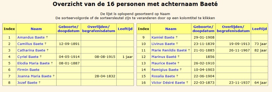 In PHP-Flexitree zoek ik in de letter B-index op de naam Baete. (bijlage 1)