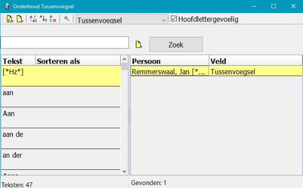Menu > Stamboom > Eigenschappen > Hoofdlettergevoelig > Tussenvoegsel