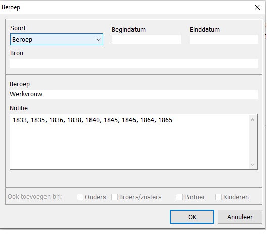 Bij het invullen van notities bij bijv "Beroep" of "Vermelding" verschijnt indien de notitie vrij lang is, de reeds bestaande tekst in een venster dat meerdere regels bevat zodat de volledige notitie zichtbaar is.