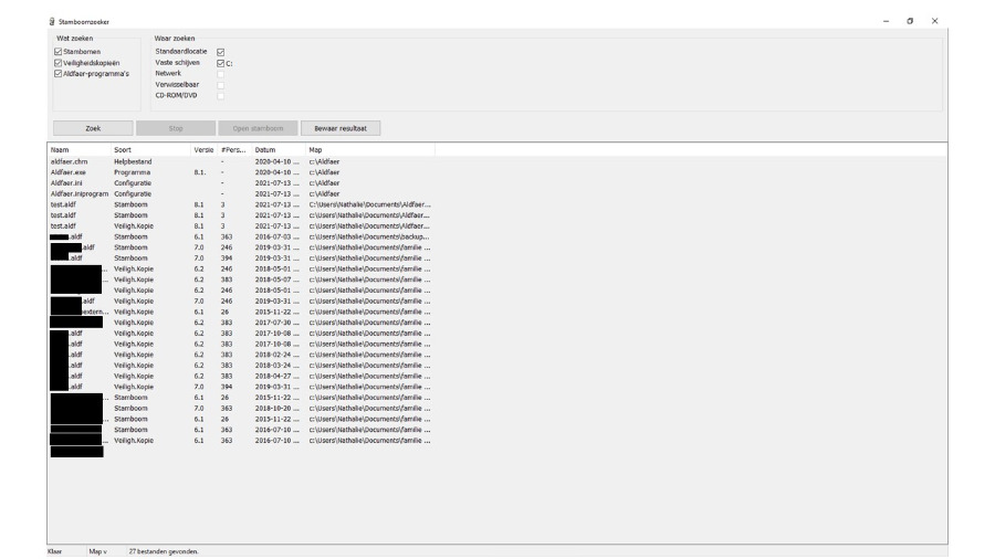 13 jul 2021 19:50 - 13 jul 2021 19:55Via menu Bestand > Zoek Aldfaer-bestanden > vink Stambomen en Programma's aan > vink toepasselijke schijven aan > ZoekNASO schreef : ......maar ik snap 'zoek aldfaer-bestanden met vink voor programma's en stambomen' niet.