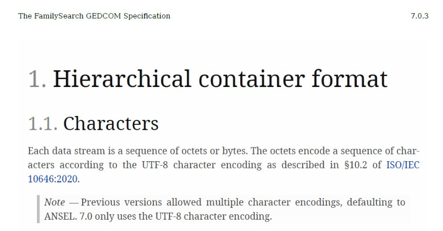 Gedcom 7.0 is heel duidelijk dat UTF_8 gebruikt moet worden en niet ANSEL