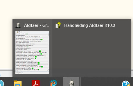 Als ik op de statusbalk muiscursor over Aldfaer icoon beweeg, zie ik links aldfaer en rechts zart vlak met kop Handleiding Aldfaer R10.0, maar als ik de muis er naar toe beweeg, gebeurt er niets.