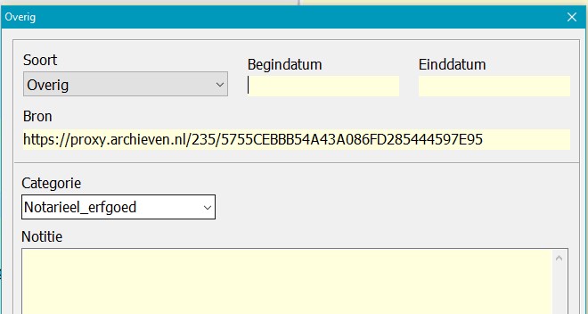 geeft JayCee een voorzet dat je e.e.a. in Overige feiten zou kunnen plaatsen. De categorienaam kun je een vast patroon geven door deze "Notarieel_xxxxxxx" te noemen en in de bron de link naar BHIC. Als je dit doet voor alle personen die genoemd zijn in de akte dan kan er een Groep "Notarieel" worden gemaakt die met een te ontwikkelen sjabloon een lijst-uitdraai maakt, gesorteerd op Categorie/bron/naam persoon.