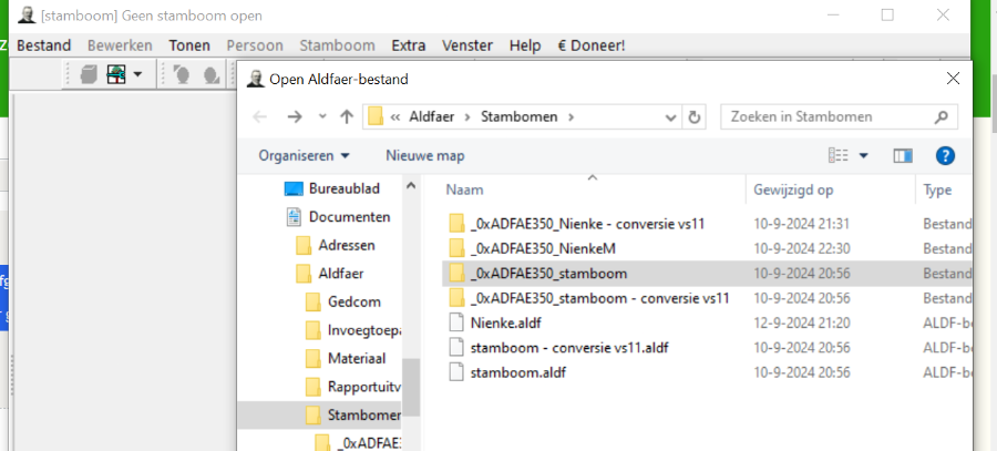 12 sep 2024 11:55Beide geconverteerde stambomen hebben nu versie 11.0 en van deze twee zijn er ook "voor conversie vs 11.aldf" bestanden.Kunt u eens met de Stamboomzoeker (Bestand > Zoek Aldfaer bestanden) kijken welke versie die stamboom heeft?Ik heb hetzelfde probleem.