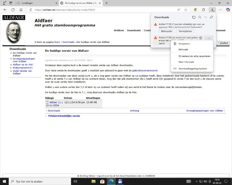 Het probleem zit 'm inderdaad in Defender. Bij het downloaden van Aldfaer komt er rechts bovenin de kreet "Download geblokkeerd". Je kunt dan aangeven, dat de download veilig is - alleen - dan heb je de download zelf nog niet.. Ik heb dat sein "veilig" aan Microsoft gemeld, maar hun reactie is voor mij nog onduidelijk; wel zie ik dat zij bij mij maar één site kennen, terwijl andere downloads geweigerd worden. Wellicht kun jij daar eens verder induiken voor een definitieve oplossing, want daartoe ontbreekt mij te veel inzicht.