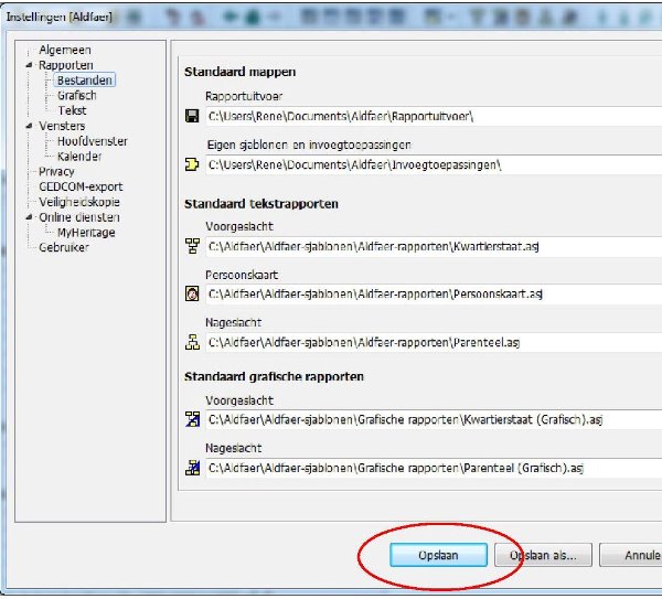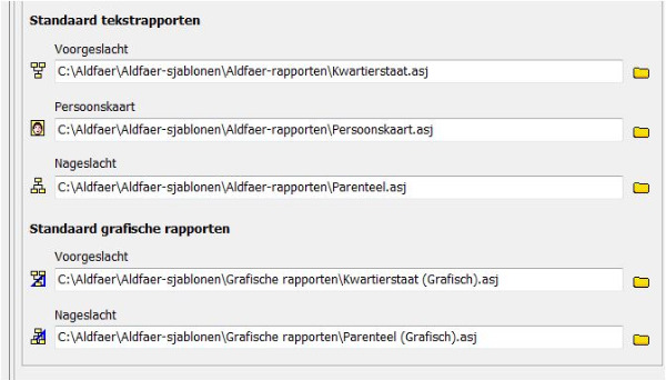 Controleer of uw instellingen voor rapporten identiek zijn als deze in de bijlage. Let vooral op het koppelteken tussen Aldfaer-sjablonen en Aldfaer-rapporten.