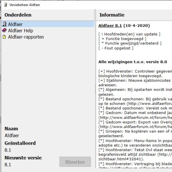 Er rest u om nog te kijken bij Help>Versiebeheer Aldfaer> derde regel over Aldfaer rapporten die bijgewerkt moeten worden.