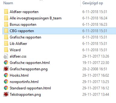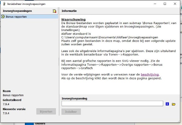 \Users\uw_naam\Documents\Aldfaer\Invoegtoepassingen. Dus op de D-schijf. Ook daarheen heb ik de inhoud van Invoegtoepassingen gekopieerd.Maar als ik nu in Aldfaer voor Rapporten kies, krijg ik alleen Standaard tekstrapporten en Standaard grafische rapporten. Dus Overige rapporten is helemaal verdwenen. Er zijn dus ook geen Bonusrapporten meer....