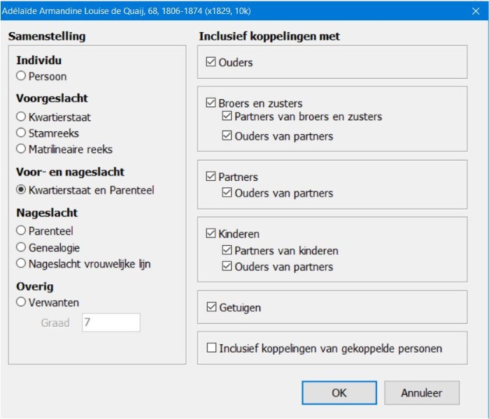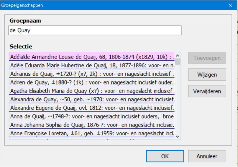 Ik heb ooit eens een groep gemaakt van een tak in mijn bestand op basis van voor- en nageslacht met alle vinken aan behalve de laatste. Vraag me niet meer hoe want het is al enkele jaren geleden. Ik vermoedt dat ik eerst één persoon heb ingevoerd in een groep en vervolgens vanuit de personenlijst alle "Quay/Quaij" heb toegevoegd.