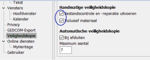 Ad2: Gisteren was de laatste versie familieroelofs_04-02-2023-2210.aldf Als nieuwe gebruiker zijn er per dag dat er aan de stamboom gewerkt zijn er per dag vaak meerdere aldf bestandsversies gemaakt. Het grote voordeel ervan is dat als starter je daarmee een extra stuk zekerheid inbouwt om bij een ongewenste vergissing dus heel snel terug te kunnen gaan naar een versie waarvan het zeker is dat het onderhavige probleem nog niet bestond. Zou er geen versiebeheer op de dag zelf bestaan dan zou er terug gevallen moeten worden op eerdere veiligheidskopieën (automatisch of handmatig aangemaakt) of handmatige backups. Standaard worden er alleen veiligheidskopieën gemaakt bij het afsluiten van Aldfaer. Voor een handmatig actie daarvan zijn er nog nog aanvullende vinkjes/opties mogelijk bij de Instellingen, bereikbaar via het menu van Aldfaer.