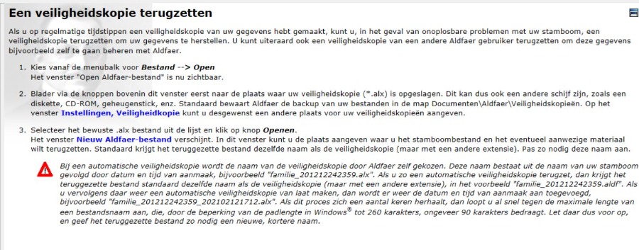 Als we de Adlfaer handleiding bekijken dan is er een heel verhaal geschreven hoe het terugzetten van de stamboom via een veiligheidskopie uitgevoerd moet worden. Zie plaatje onderaan.