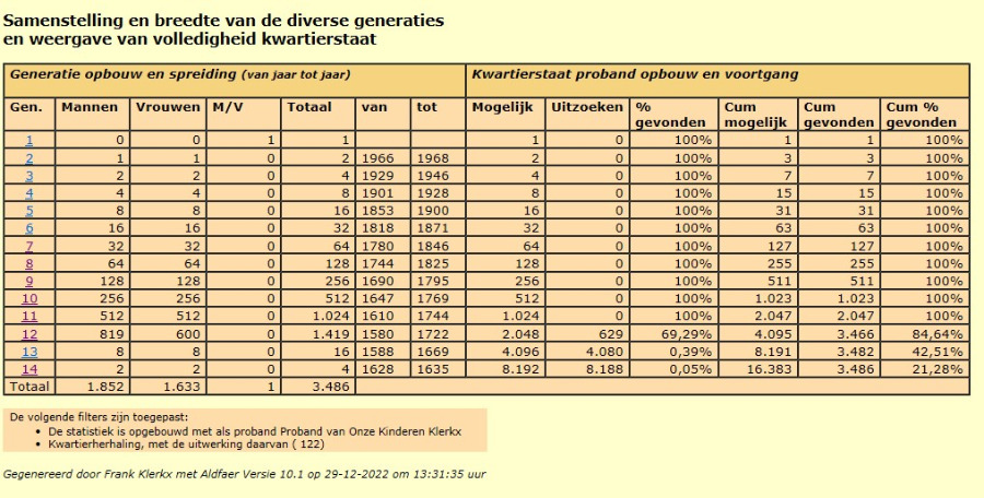 Vervolgens zie ik 14 generaties verwanten ipv 12. (totaal 122 stuks kwartierherhalingen)