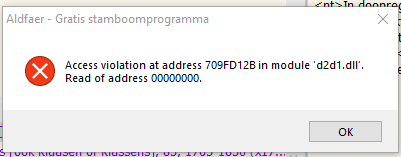 Ik heb in mijn database (2052 personen) bij 19 personen dat ik een "Access violation" krijg, gerelateerd aan "d2d1.dll" bij elke actie zodra deze persoon is geopend met de volgende instellingen.
