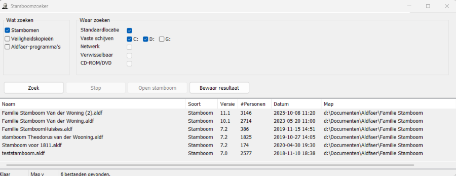 Ik heb beide opties geprobeerd: via download vanaf de website en via versiebeheer in de applicatie. Beide gaven dezelfde melding. Pas nadat ik het stamboombestand in de map c:\aldfaer\data had geplaatst kon ik het zonder problemen openen. Ik denk dat ik die map dan zelf heb aangemaakt omdat die directory ook op meerdere plekken in het forum werd genoemd.