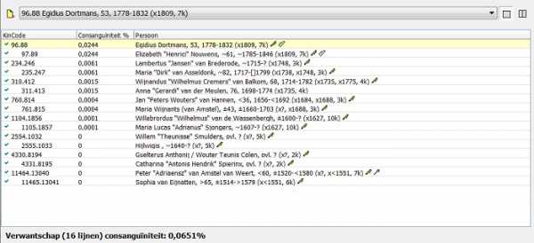 rechts komen inderdaad de 16 gezamenlijke voorouders op en kan je per lijn bekijken hoe deze dan wel loopt tussen twee personen.