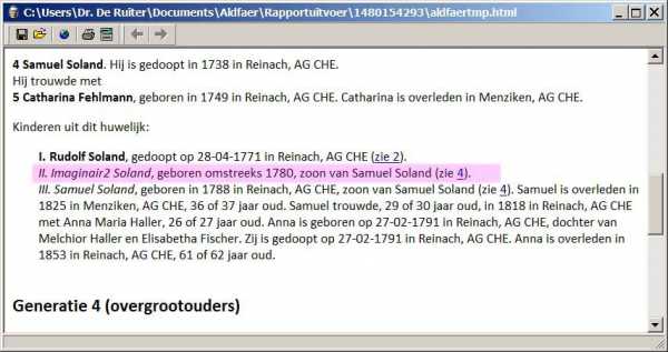 Hallo, ik heb hetzelfde probleem. Het is gestart na de overschakeling van Aldfaer versie 4 naar versie 6.1. Mijn gehele stamboom van 2500+ personen kon ik voorheen correct afdrukken in de Aldfaer kwartierstaat. Nu wordt er bij elk kind dat zelf geen (bekend) nageslacht heeft de naam van de vader toegevoegd. Het is nu zo:
