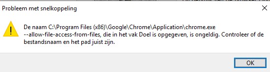 Om het lokaal ook mogelijk te maken dient u een snelkoppeling voor Chrome op het bureaublad te maken en daarvan eigenschappen opvragen en daarin doel uitbreiden met --allow-file-access-from-files